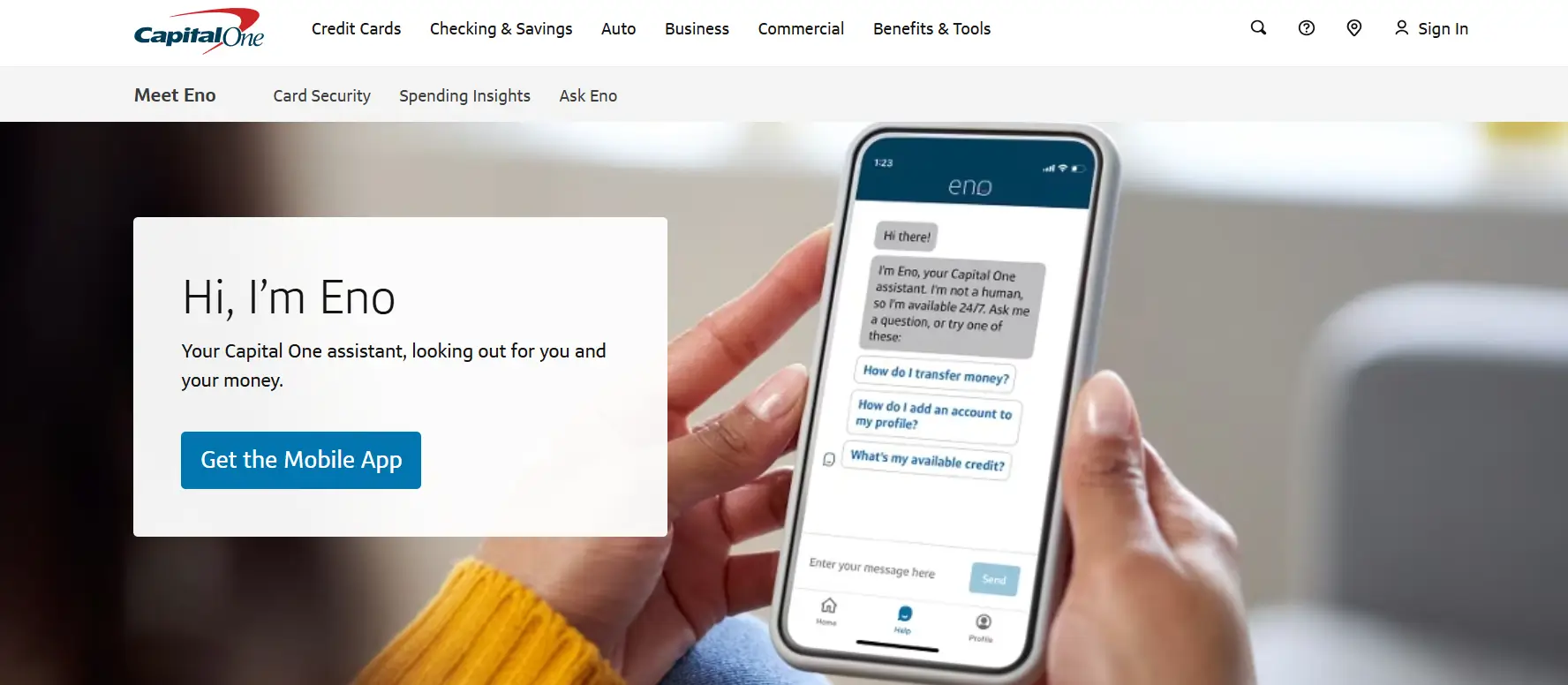 Eno was launched in 2017 and quickly became a cornerstone of Capital One’s digital engagement ecosystem. Designed to provide real-time, conversational support for millions of customers, Eno leverages natural language processing, machine learning, and predictive analytics to deliver assistance that feels intuitive and human-like. From answering basic account questions to detecting fraudulent charges, Eno demonstrates how AI for B2C can reshape consumer engagement in an industry where trust, speed, and accuracy are paramount.