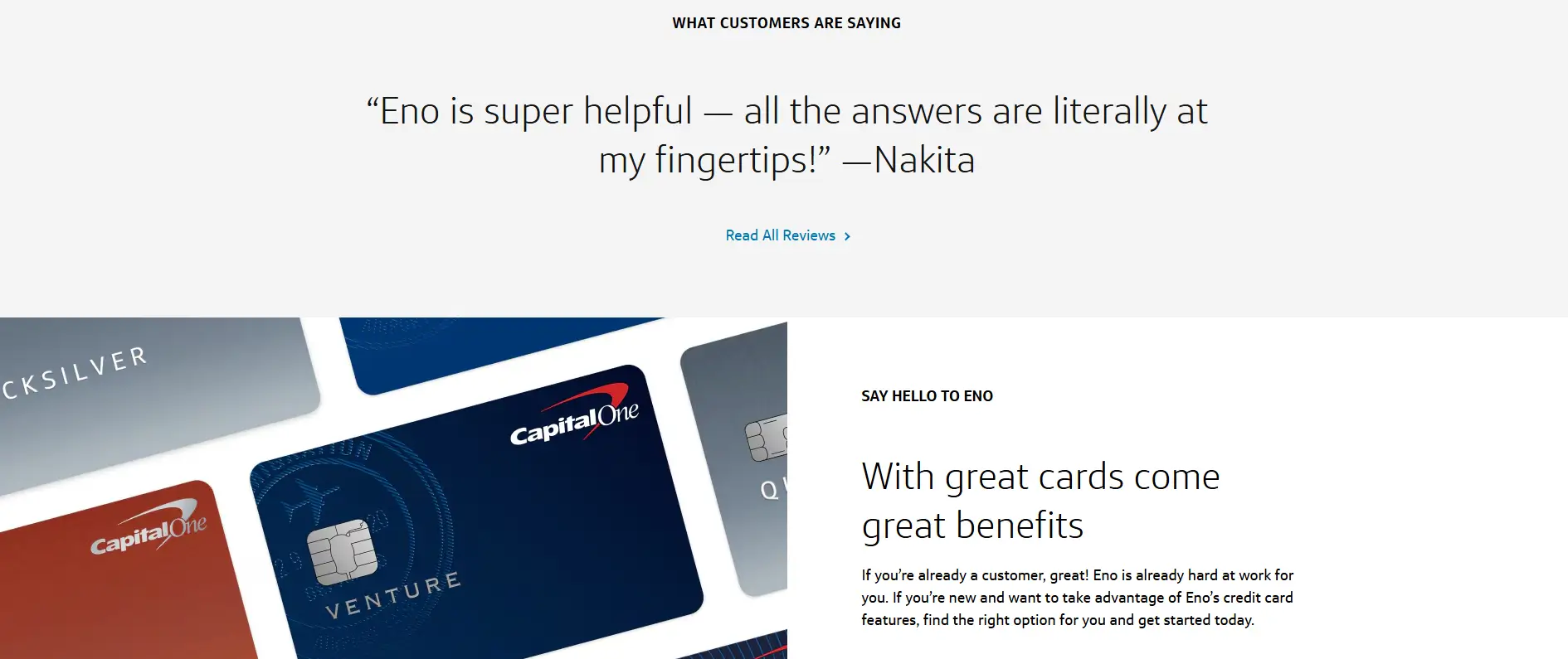 - Improved Customer Engagement: Eno has become a daily digital companion for millions of Capital One customers. By offering conversational, user-friendly access to account information and financial insights, Eno increases engagement with the Capital One ecosystem. Customers are more likely to interact with the app regularly, leading to stronger brand loyalty and higher satisfaction.